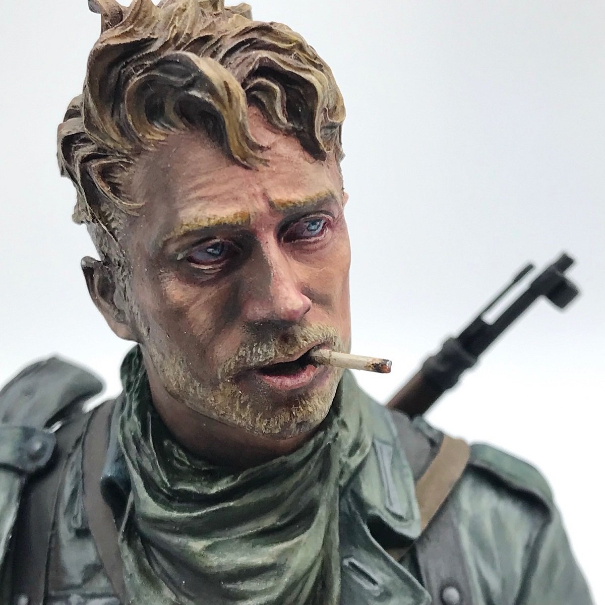 という事でこれまたご尊顔から見ていきましょうよ!・・・・と言いますか、すんばらしきイケメン!26万人もの兵士が投入されたという最悪の攻防戦の従軍する1人の兵士の決意のようなものが感じられますね!右から光源を当てられている設定という事で右目の瞳の色が一段明るく塗られているのがとても印象的です!思わずピカって光っている様に見えて目が合ってしまいますね。またがっつりとした陰影表現が施されておりますが不思議と違和感ない・・・・もとより堀の深い顔立ちですが目元のシャド~、そして個人的には苦悩を感じる眉間の皺表現とかすんごい好きです!