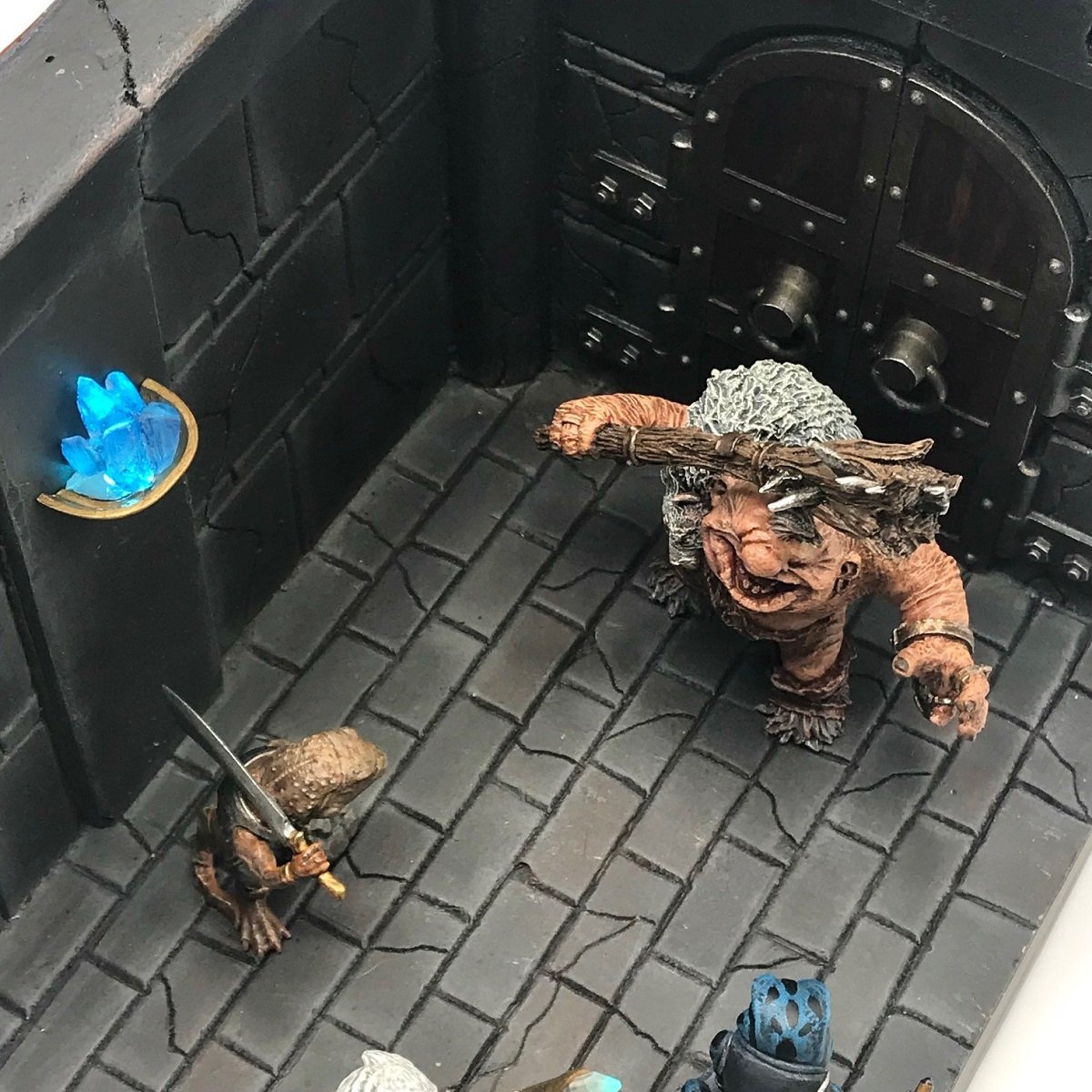 そしてやっぱりすごいのは上から見てみて!このベースも忘れちゃいけないのです!いや~見事にダンジョンですよねっ!壁や床なども薄暗いダンジョンとして濃いめの色で塗装を施しているので薄暗い感が出ていて素敵です!そして階段に続く扉なのでしょうか?暗いながらも木目というか重厚なつくりの隙間に見える木製表現が何とも素晴らしい味を演出しております!そしてやっぱり目を引く水晶のライトですね!こちらもしっかりオンオフ可能!透明なレジンを生かしたつくりはさすがです!こう表現するのは不思議な感じですが綺麗な塗と綺麗な汚し!また正確な建築技術!圧巻です!