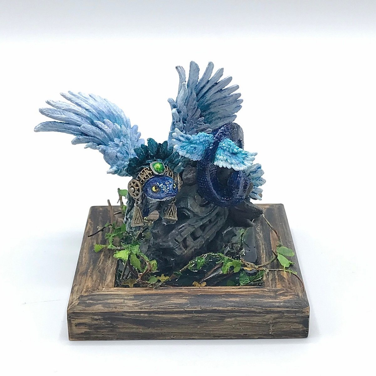そんで忘れちゃならないこのベースですね!木枠の中に湿地帯のジャングルを表現してくださっているではありませんかっ!なんてお洒落なんでしょうか?また木枠に関してもトーンを落とした色味が渋くてGOOOOD!ツタ系の植物が巻き込んでいることで何とも鮮やかですね!また地面に綺麗に水表現をするだけでなく、ツタなどにも水滴を配置するあたり・・・何ともこだわりを感じます!UVレジンでしょうか?高い透明度と部分的に配置される水滴がケツァルコアトルさんのつるっとした美しい肌と相まってとっても素敵っ!イキイキとした作品本当にありがとうございます!