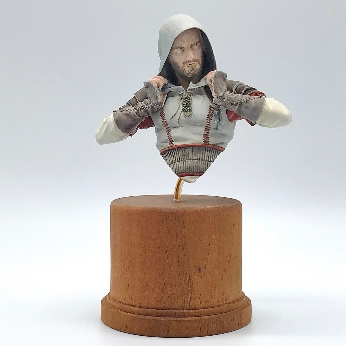 はい!本当にすんばらしいほどに塗装面がきれいでおなじみのomega-point様ですが、店長は凝り固まった頭で胸像の所謂下から覗いた部分などは黒く塗る!とかってに概念化しておりましたが、まさに目からうろこ!服などと同じ色で塗ってもいいじゃない!そして白をメインカラーとしておいていただいている中、胸像ベースにつなげているアルミ線ですかね?が金色ってめちゃ相性いいですよね!マジ綺麗!そしてそのアルミ線も直線でそのまま指すのではなく曲げて動きを付けているあたり・・・・流石のセンスなのだ!