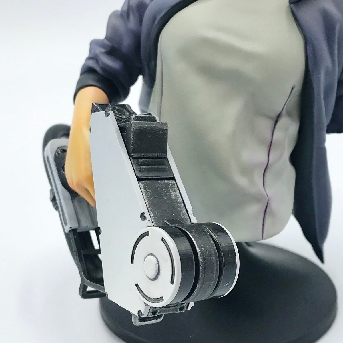 ハイそれでは正面からアップで見ていきましょうね。作品のタイトルからしてスキャナーだと思うのですが、何とも不思議な武器感が漂っております!モノトーンで無機質感を演出しつつ、中の金属部分はしっかりとエッジを利かせた金属表現をすることで使用感を演出・・・にくいですねっ!また正面から見るお洋服もラインに少しもやっと赤味を広げていらっしゃるのでなんだか少し光っているかのような気がするのも素敵ポイントですね!一部汚しはするものの汚しは最小限にすることで塗装面が何とも綺麗な作品となっているのです!すんばらしい~!