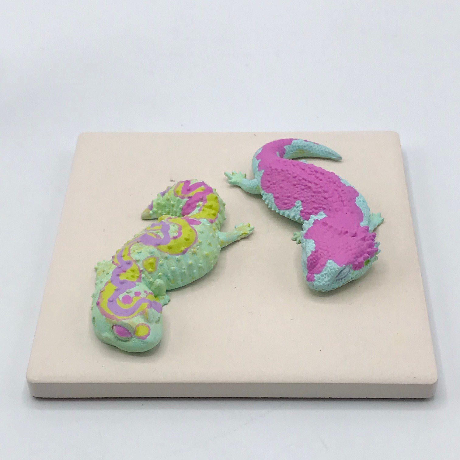 そして2匹同時に見てみましょうぞ!この塗もですが色の塗の変化や範囲をジグザク!S字にしていただいていることに皆様お気づきですかい?そのままですがジグザク配置ともいわれ作品に奥行きが生まれたり、単調にならなかったりするので見ていてとっても楽しくまとまりのある構図となっております!また2匹を全くの横並びにすることなく配置していることで奥行きも生まれているので本当に素晴らしいですね!フトアゴさんのほうにもイエローを少し使う事で紋様や塗り方は異なるものの作品としてもまとまりを高めている・・・・流石なのです!生き物万歳!
