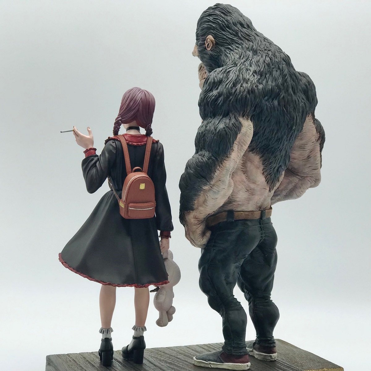 というわけでまずは恐ろしいほどの存在感のそのゴリラさんです!先ほどもお伝えしましたがこちら【坊太郎】さん原型のフィギアとなっております!驚くべきはこちらのキット・・・・1っ発抜き!んっ?どういう事?となった方そういう事です!ぜひTwitter見てみてね!と言うわけで1っ発抜きで抜かれたキットをバシッと塗装!細かなモールドが緻密に並んでおりますが、その肌の塗装はやっぱり必見です!ただ1色で塗りうのではなく積層された各種の色味が造形に深みを増しております!また瞳も素晴らしいですねギラリと光る眼光を見事に描き込み!ちょっとお髭を生やすことで老齢のすごみすら感じさせる・・・・やばい惚れる!