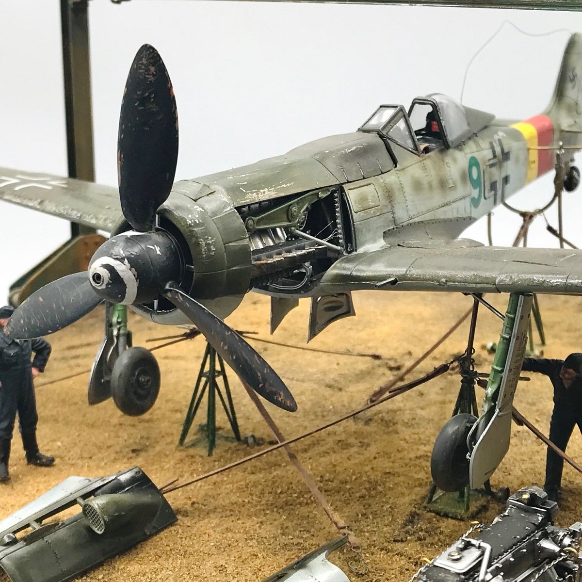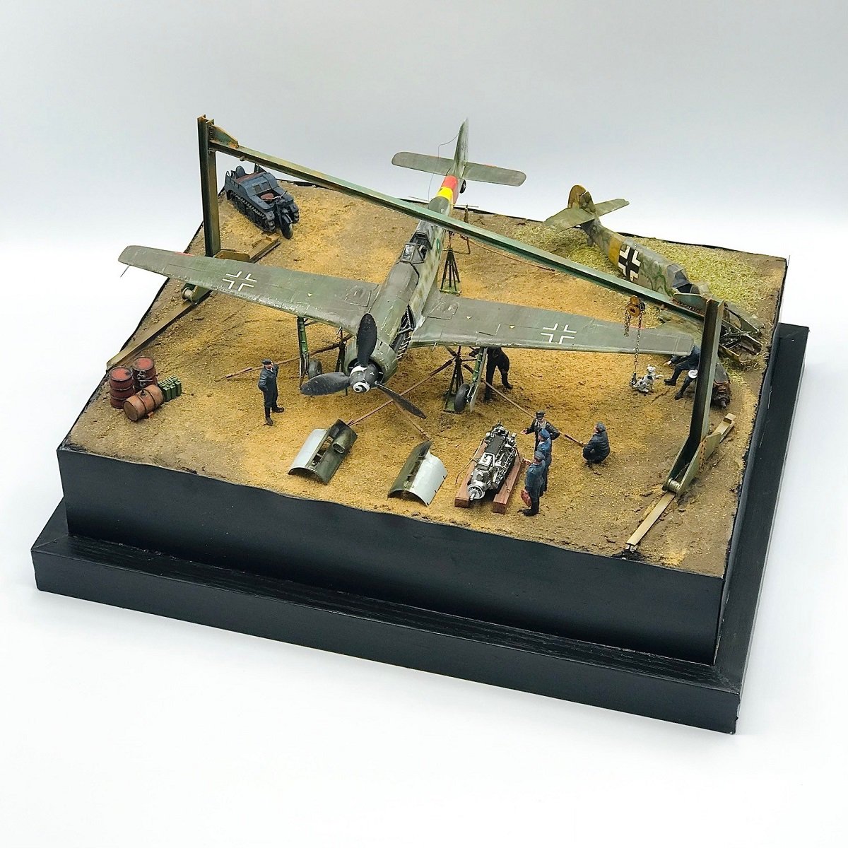 そして実機だけでなくその周りに配置された整備士たちも1/48という1/35よりさらに小さい大きさながらもめちゃ表情豊かに描かれているのがわかるだろうか・・・・・その数なんと7人!それぞれエンジン回りであったり主翼を見上げていたりなどしっかり一人一人ストーリーがあることが伝わりますね。またその周りの小物(木材の年輪手が手描き!)などこだわりが本当にすごい!