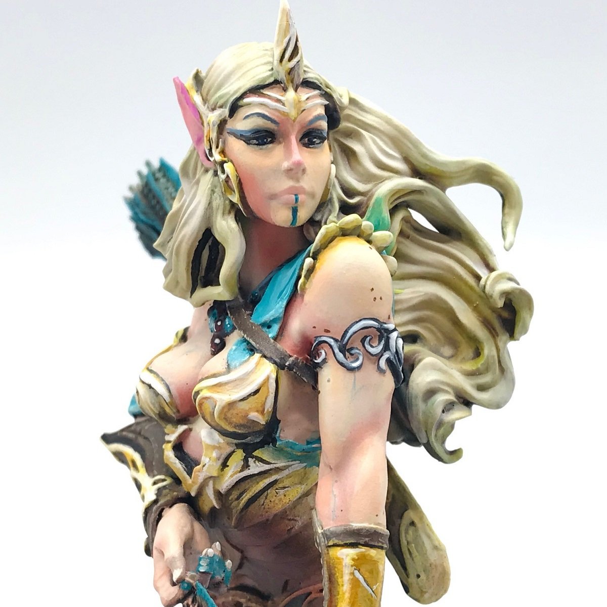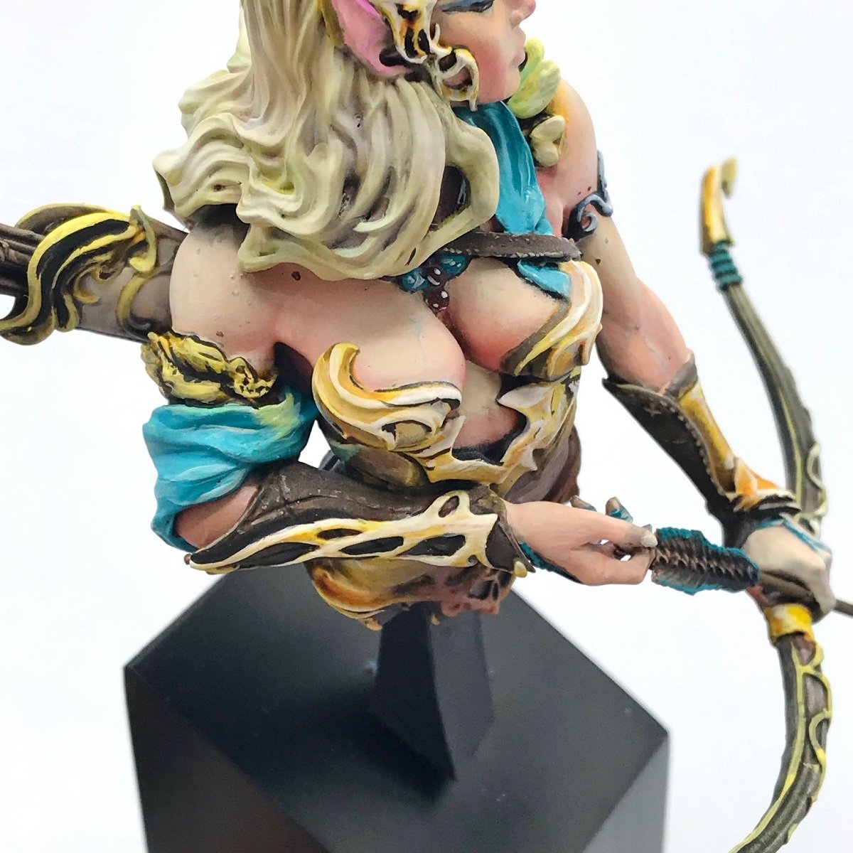 ちょっと下からの横のアングルで全体のカラートーンも見ていきたい!エルフと言えば皆様想像するのはどういった容姿でしょうか?店長はもちろん色白な美人さんです!しかして今回のコメントやタイトル通り若いエルフをイメージという事で色白をベースではありますがしっかりと一段影の落ちる部分で強めの血色を入れることで何とも健康的なエルフを表現していらっしゃる!また全体のカラーイメージのアイスイエローに対して弓の青い発光表現!しかも弓度と流れる布の方向も同じくすることで動きのバランスがとれている・・・素敵!