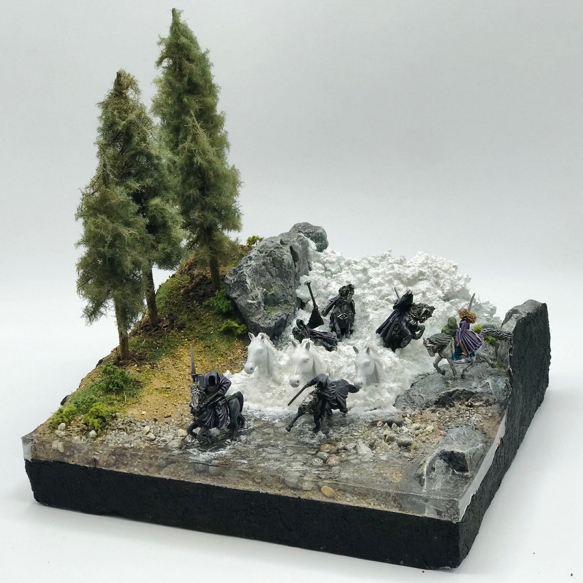という事で見ていきましょうよ!全体的にすごすぎてどこを説明すればいいのやら迷う店長です!という事でまずは一際目を引く白馬も現れるこのナグルスを押し流そうとする洪水ですよね!映画でアルウィン(エルフの人)がエルフ語で何かを唱えたあと川が増水して白馬と共に押し流していく場面を見事に表現!ぶわ~!と音が聞こえてきそうな川の造形が本当に圧巻ですよね!