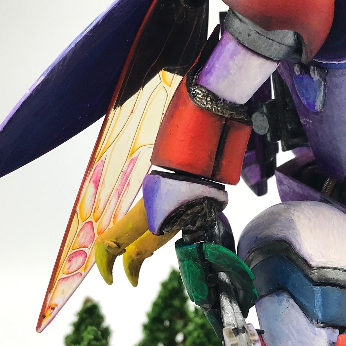 羽とか各部のアップも見ていきましょう!まずは羽ね!しっかりと色を重ねることでキットそのままの無機質なパーツから生きた羽根にランクアップしましたっ!すっごい質感だぞ~!あとこの関節とか作りこんで頂いてるんですかね!めちゃフィット感がいい味を出しております!オーラバトラー系の関節って有機的でめちゃかっこいいですよね!あと各部の影が紫っていうのも美しい!紫になることで赤との相性も良く彩度を落とさず影を表現していて素敵です。