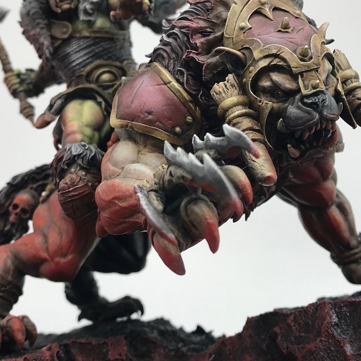 はい!それにまたがるおっさん?いや肌の質感的には比較的若いオークの将軍様が乗っております!この光の描き込みというか鎧と兜のシンクロしている光り輝いてる感・・・・やばい気持ちがいいっ!作品全体を通して使っている赤に対して明るめの緑がいい感じに映えていて素敵です!またよ~く見てくださいね、皮のダメージ感があまりにもナチュラルに溶け込んでいるのがとても印象的です。