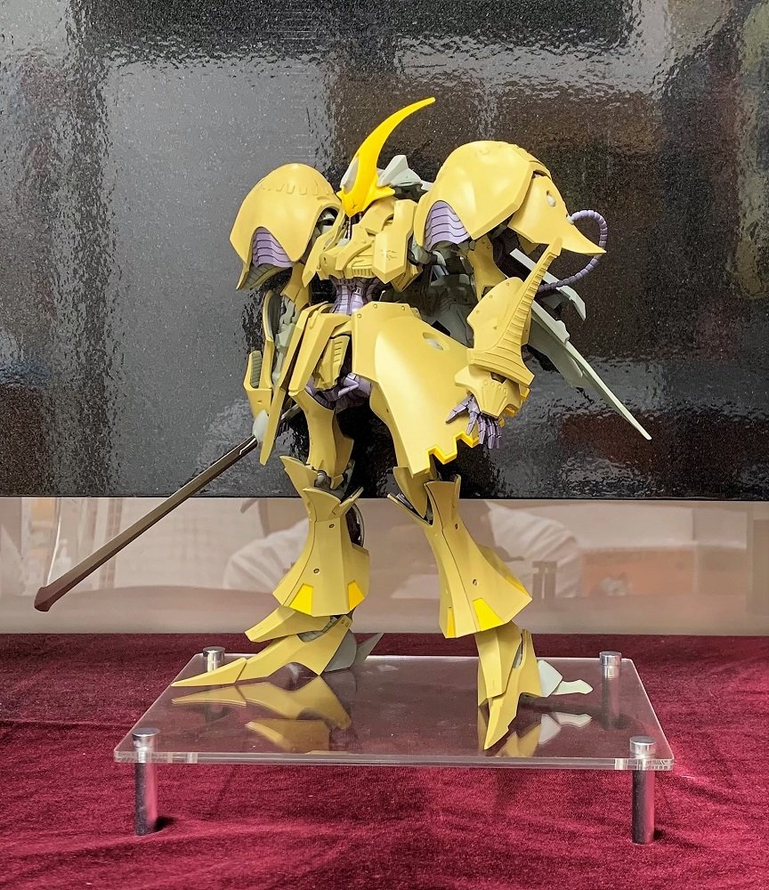 設定資料集「ナイトフラグス」で発表された"L.E.D.ミラージュV3"のデザインに基づき、1/100同様にフレーム構造や半透明化積層装甲など本騎の見所はそのままに、今なお強烈な印象を残す、『ファイブスター物語』の冒頭で繰り広げられた衝撃的な戦闘シーンを彷彿させるベイル装備状態にて立体化。