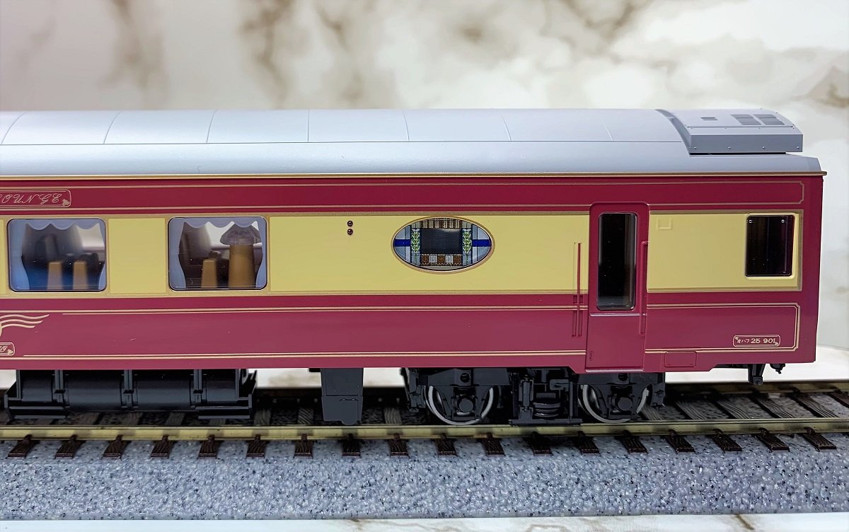 そして、もう一つの見所の一つとして、屋根のクリアパーツにバーカウンター上部の扇形を描く特徴的な間接照明の様子を再現できるよう彫り込みがされています。これは是非室内灯を入れたい車両ですね!