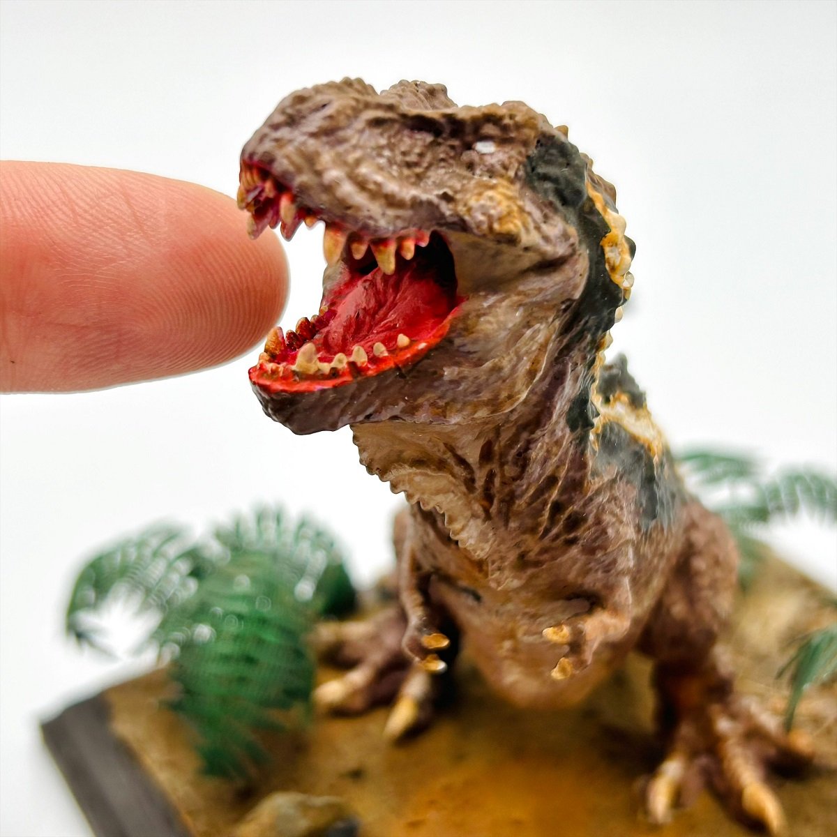 はい!続きましての作品はっ、ガメラからの~!恐竜!という事恐竜好きであれば誰しもが知っているレジェンド恐竜!恐竜 of 恐竜!そうぅティラノサウルス様がやって来てくださったぞ~!恐竜の関わる作品であれば大体メインをはるのがティラノさんですよね~、今回はそんなみんな大好き恐竜造形で一目も二目も置かれている大人気作家【ねんど星人】さんのキットを自ら3Dプリンターで小さくスケールダウンしたキットでご参加なのですよ~!