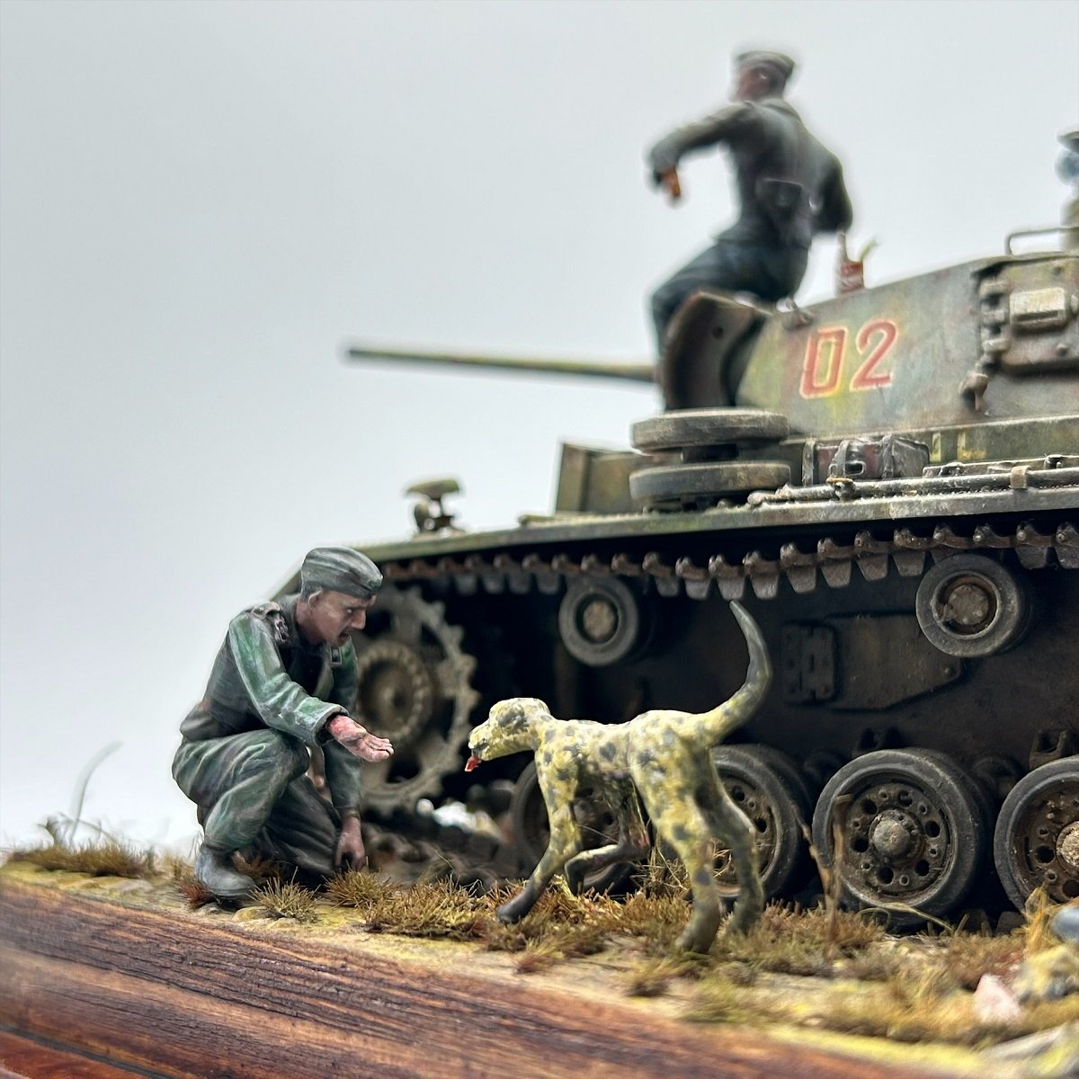 そして今回のブログ最後の刺客がなんと第一回ファレホコンテスト!ホビースクエア秋葉原のミリタリー部門において金賞を獲得した作品っ!みんな大好きTAMIYAさんのもうどんだけのロングラン?となりそうなくらいに定番と化している1/35 Ⅲ号戦車L型で登場をしてくださいましたよ~!長砲身なのだよっ、装甲もりもり?と言うか主砲防盾部の増加装甲板とかなんか浪漫を感じざる負えませんよね。そんな戦車だけでも浪漫の塊な所・・・ケン・マツムラ氏の手によって広がった世界を見ていこう!