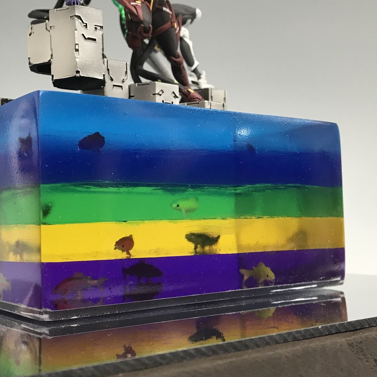 ベースは、綺麗に色分けをされた透明レジンで「層」が表現されており、ミニチュアとの相性も良いですね!!また、その中を泳ぐ魚たちがいい味出していますね!!
