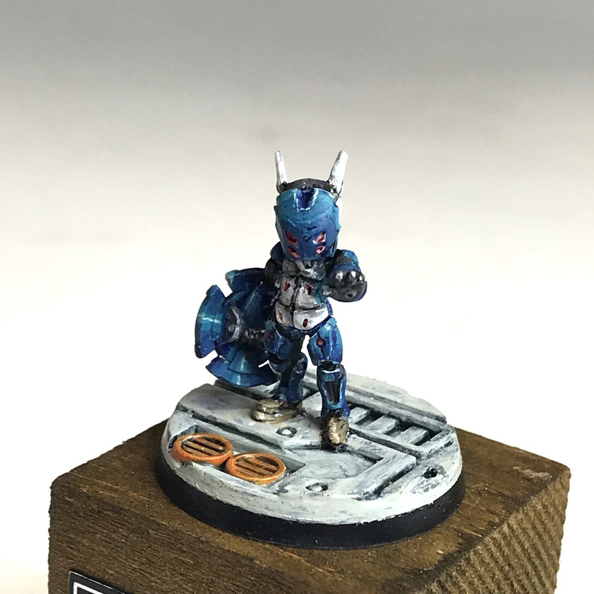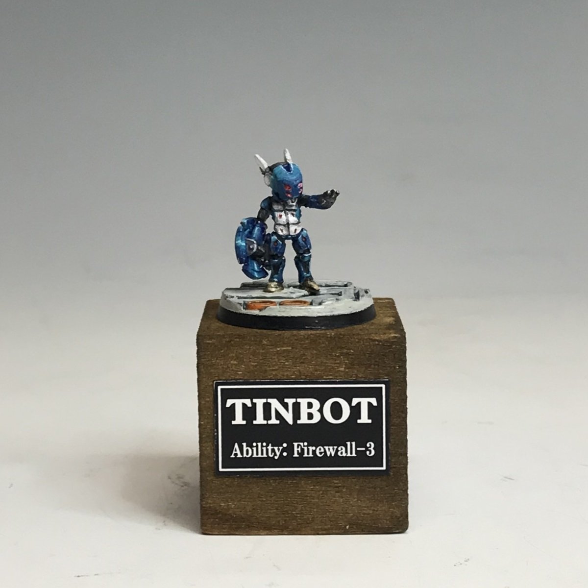 続いてはミニチュアゲームメーカー CORVUS BELLI 社より発売しているミニチュアスカーミッシュゲーム 「INFINITY」から「TINBOT」!「INFINITY」というゲームが28mmスケールのミニチュアを使って遊ぶということで、この作品実際に見るととても小さいです!木製台座部分だけで見ても高さは3㎝程しかないです!そんな小さなモデルを色分けだけでも大変ですから、本当にすごいですね~!!