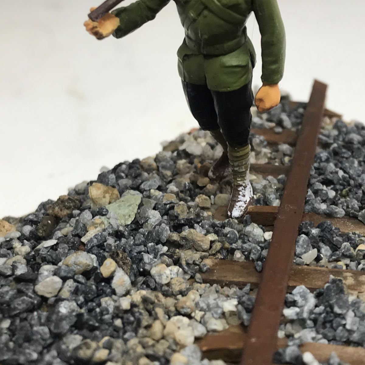 コメント:とある写真をモデルに作りました。線路や復員兵、下地にファレホを使いました。