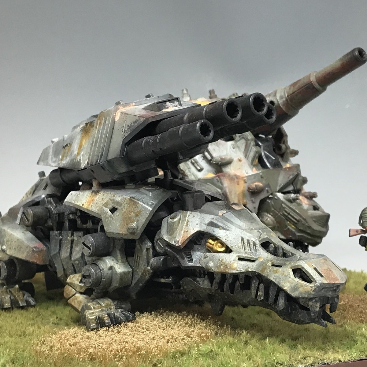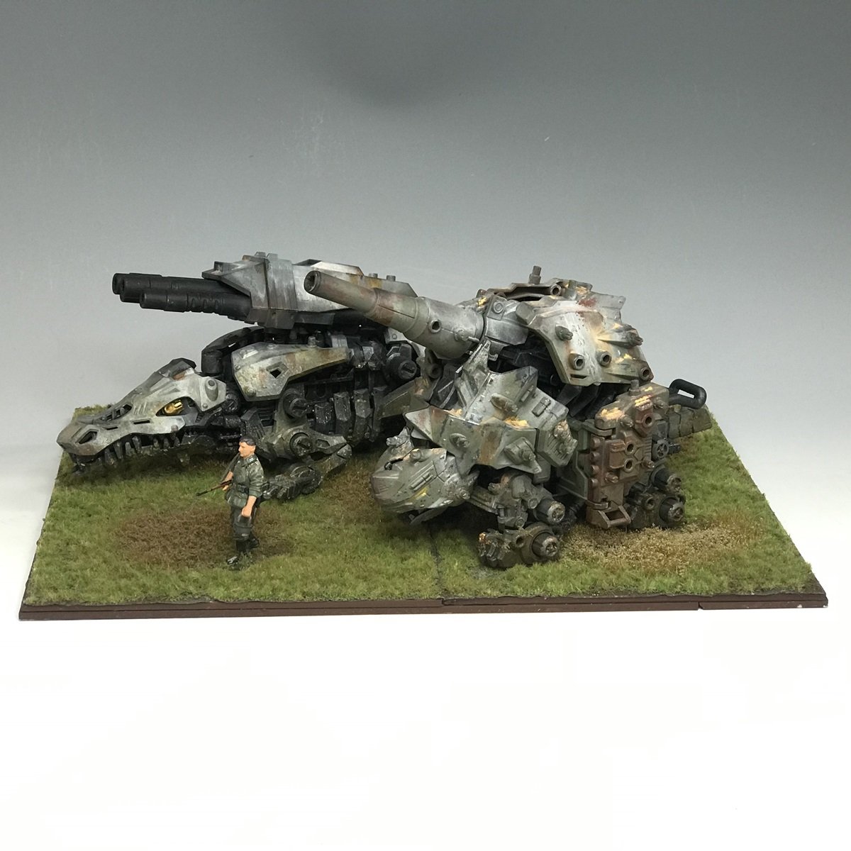 アリゲーター型のゾイドですが、背中の武装はなんとゴジュラスのもの!絶大な威力を発揮しそうで、味方の兵士もさぞ心強いと思います。こちらのゾイドもハードなウェザリングが施され、至る所に錆が浮かんでおりますが、戦いの時間経過を表す表現としてピッタリだと思いました!