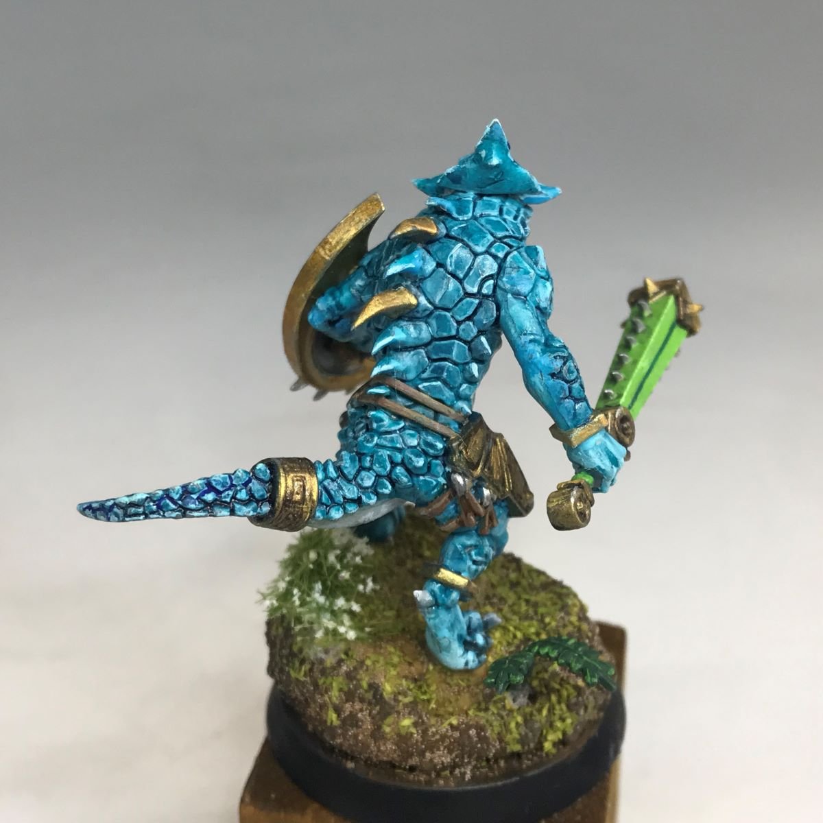 まずはGames Workshop『SAURUS WARRIORS』を使った作品です。Games Workshopといえば『ウォーハンマー』などのボードゲームが有名です!その中から今回は"Saurus"="トカゲ"の戦士とのことで、ごつごつした鱗が爬虫類っぽく、剣や盾で戦士がありますね!そんな作品ですがこちらは台座合わせてもかなり小さい......なので、じっくり近くで見て参りましょう!