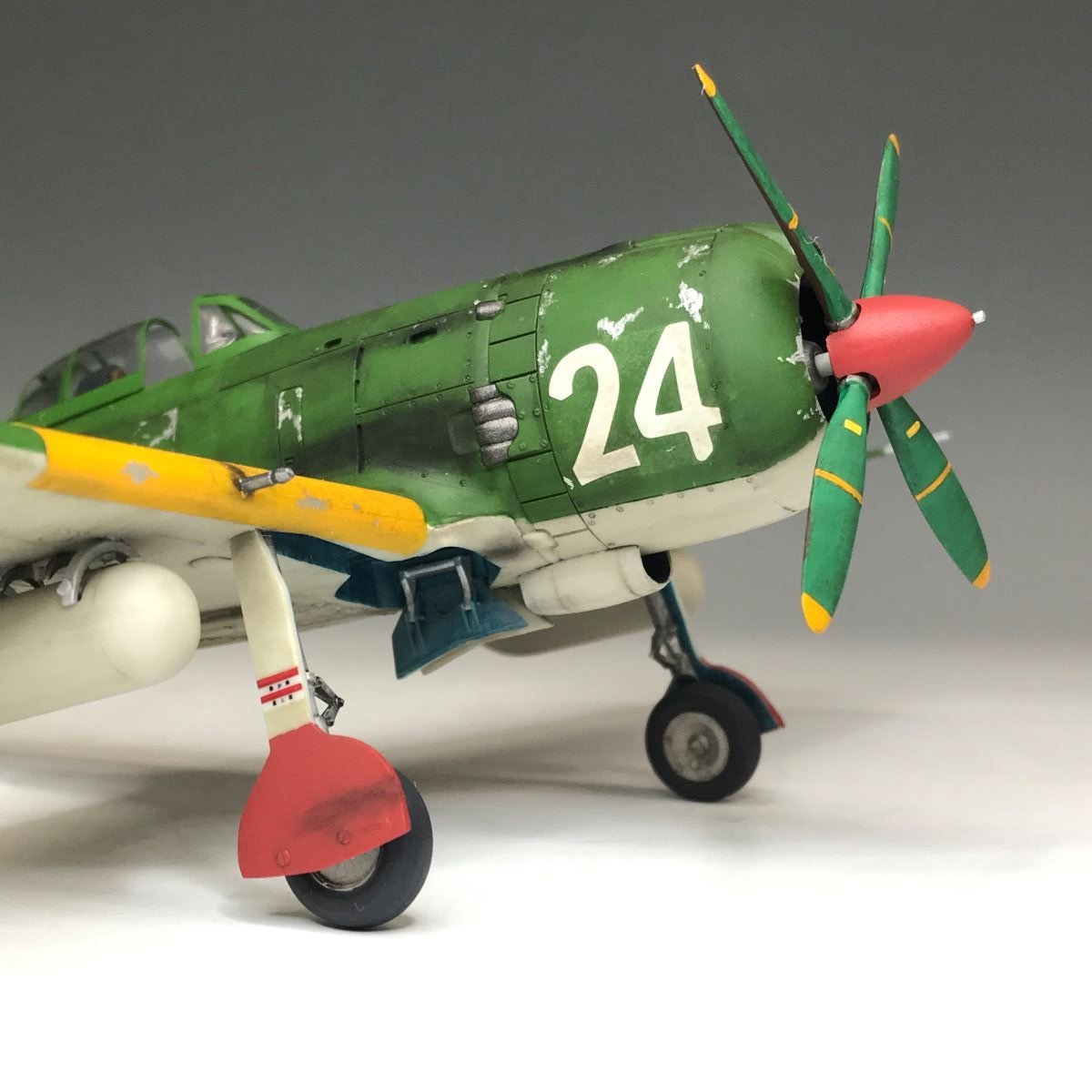 赤いスピナーキャップと、ウサギのノーズアートがカッコいいぞ。単排気管の汚れや機銃の煤汚れまで、細部のウェザリングもばっちりですね!主脚収納部や増槽、キャノピー等、もキチンと丁寧に塗り込まれております。