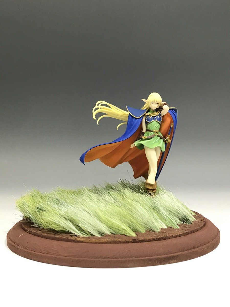 ロードス島戦記!40代の青春アニメ、あの懐かしき冒険の世界が今ここに蘇りました!まさに作品全体からあの頃の情熱と感動が伝わってきます。原作の風を感じるような繊細な造形に、きみ様の手によってさらにその魅力が引き立てられています。プライマーからトップコートまで全部ファレホ!ありがとございます。その愛情がキャラクターの優雅な佇まいに表れていますね。なびくマントと金色の髪が美しく調和し、まるでオープニングのワンシーンを切り取ったかのような仕上がりです。そして、この草地のベースが情緒を感じさせ、まるで彼女が冒険の途中で立ち止まって風の音に耳を傾けているような雰囲気を醸し出しています。そんな繊細な表現力に、見る者の心も揺さぶられますね。店長の頬に風が横切ったぜい!