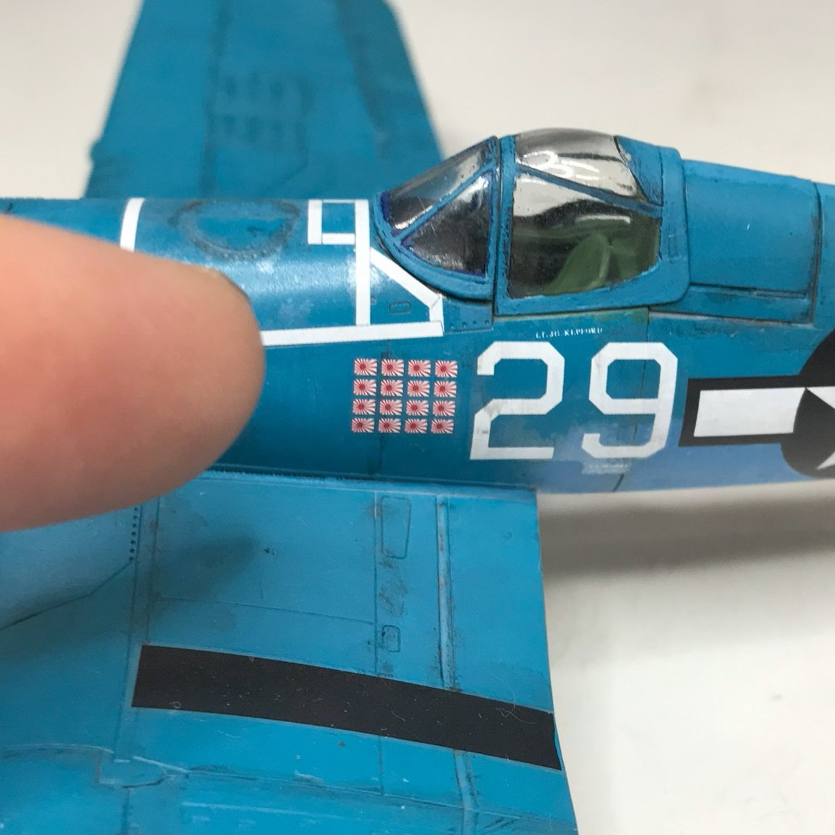 コルセアと言えば、やはり青い機体塗装色。良く見ますと、濃い青と薄い青、白で構成された3色の迷彩となっております。