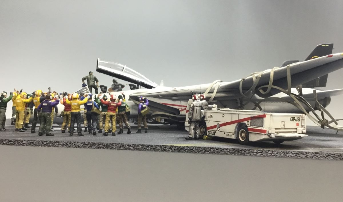 コメント:映画の帰還シーンをフライトデッキクルーを多数並べて再現しました。クルーの彩色とバリケードの製作に時間を掛けました。ファレホは台座のサイド部分全面に使用しています。