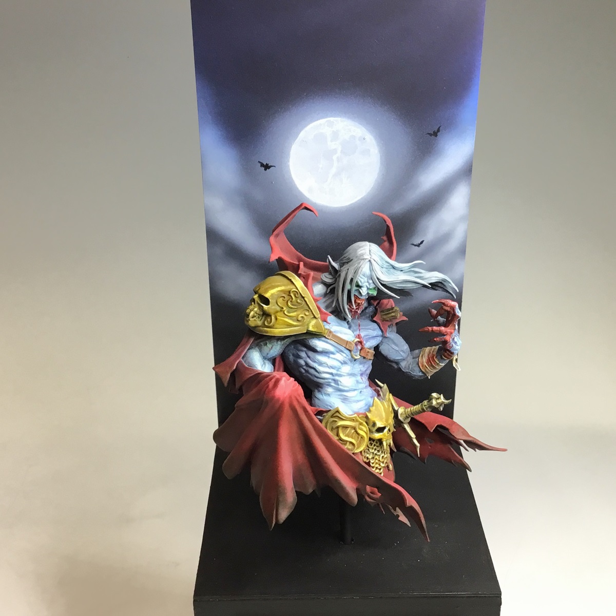 しろまるタイムのお時間がやってきましたよ~!多彩な表現で毎回驚かせてくれる「しろまるワールド」、今回もじっくり見ていきましょう。まず、このメチャ王道のストロングスタイルのミニチュア塗り!異色肌でありながらも巧みなコントラストで奥行きがしっかりと感じられるのが素晴らしいです。そして、肌や血の演出だけでなく、重厚感を感じさせる鎧のNMM(ノンメタリックメタル)表現が圧巻!以前にも増してメリハリの効いた塗装技術が、キャラクターに圧倒的な存在感を与えていますね。さらに特筆すべきは背景表現!海外ではおなじみになった描き込み背景を取り入れ、月のリアルな描写と雲の配置で、完璧な視線誘導を実現しています。消失点の効果が作品全体に立体感を与え、見る人をその世界に引き込みますね!