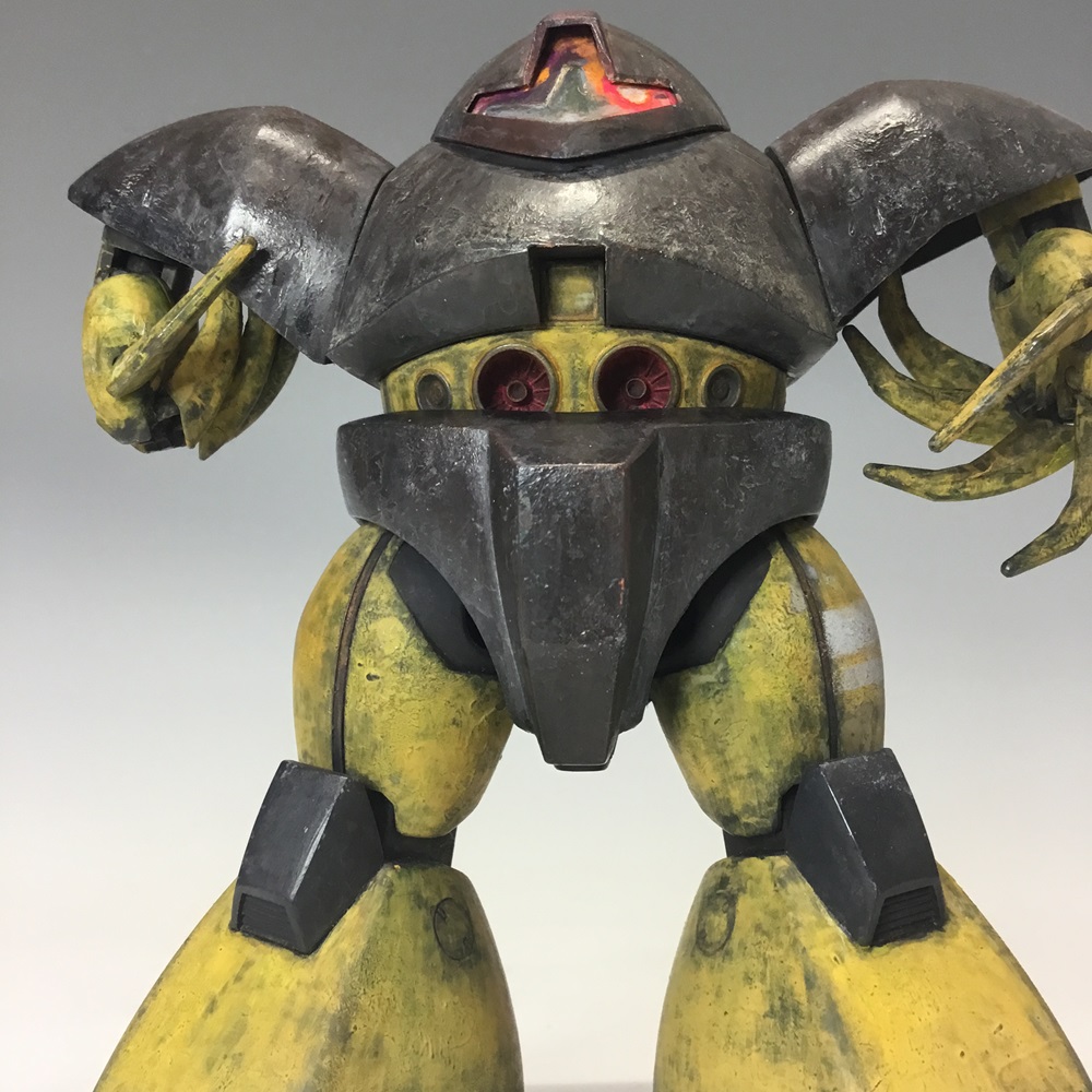 なんと 重量感あふれる 作品がやってきたのであろうかっ!!独特のフォルムでお馴染みの ゴッグさん ですが、ただの「素立ち」状態ではなく、腕収納ギミックを活かしたポージング にされているのが素敵すぎる!このひと工夫が、よりダイナミックな印象を与えてくれますね。そして注目すべきは、あえて下地を残した塗装!これがまるで 金属のウェザリング表現 のような質感を生み出しており、機体のリアリティをぐっと引き上げています。筆塗り全塗装ならではの深みが感じられる仕上がりです!モノアイの発光表現もばっちり! 「ブォン!」とまるで音が聞こえてきそうな、圧倒的な迫力を放つ仕上がりに......!!ぜひじっくり堪能していただきたい作品ですね!素敵だぁ~!