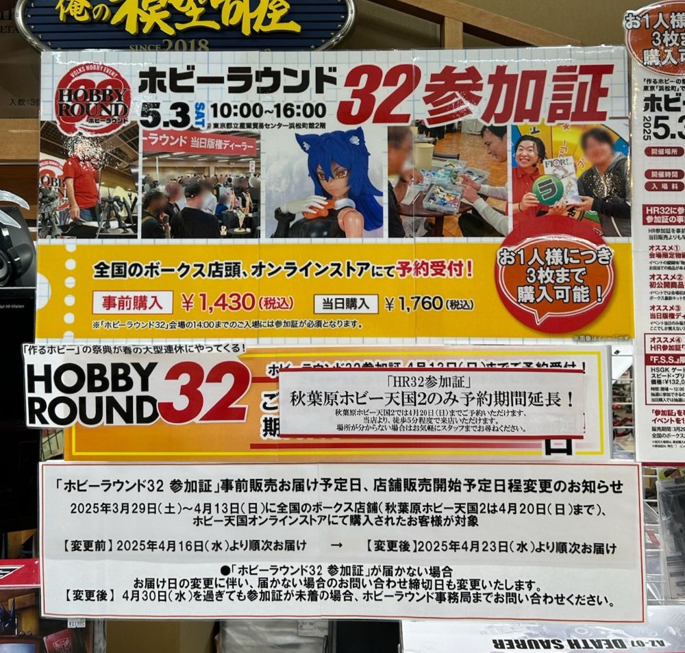 2025年4月13日(日)までの期間、事前販売を行っておりました「ホビーラウンド32 参加証」に関して郵送日と、店舗での販売日程を諸事情により一部変更とさせていただきます。
