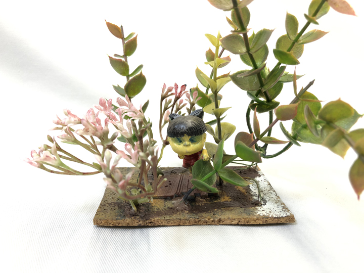 コメント:板をいろんな色に塗るところを頑張りました。髪の色を塗ったあとに、ウェザリングしました。林の下に、土の色に塗ったことが工夫したところです。林から出てくる様にしたかったので、わざとねこ娘が見えるようにしました。