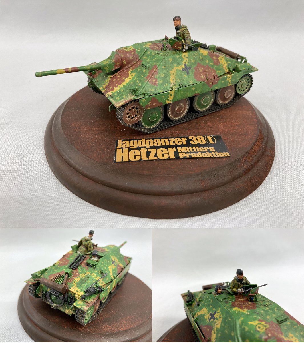 光と影迷彩が施されたヘッツァーです。履帯の下塗りとマフラー以外ファレホ筆塗りで仕上げました。