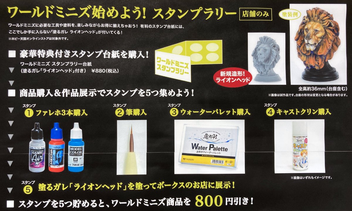 次に、ワールドミニズを塗るのにオススメな4種類の対象商品の購入と「塗るガレ ライオンヘッド」を塗って店頭に展示でスタンプを5つ貯めていただくと・・・・・