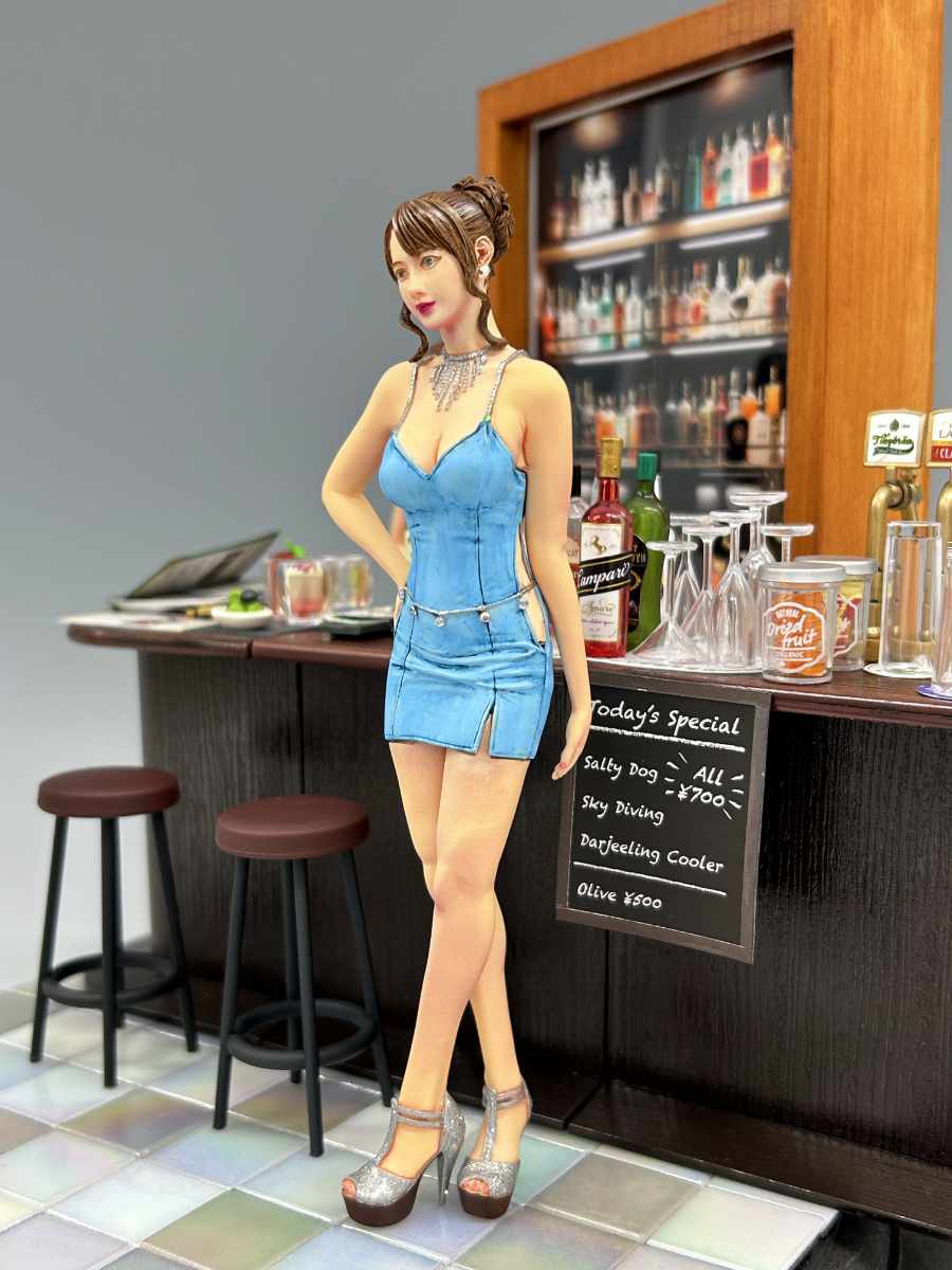 製作者コメント: オーセンティックなガールズバーをイメージ。フィギュアのドレスは平和を願いウクライナ国旗の青と黄を選びファレホ筆塗り。床は本物のタイル使用。ボトル類は食玩を加工して配置。