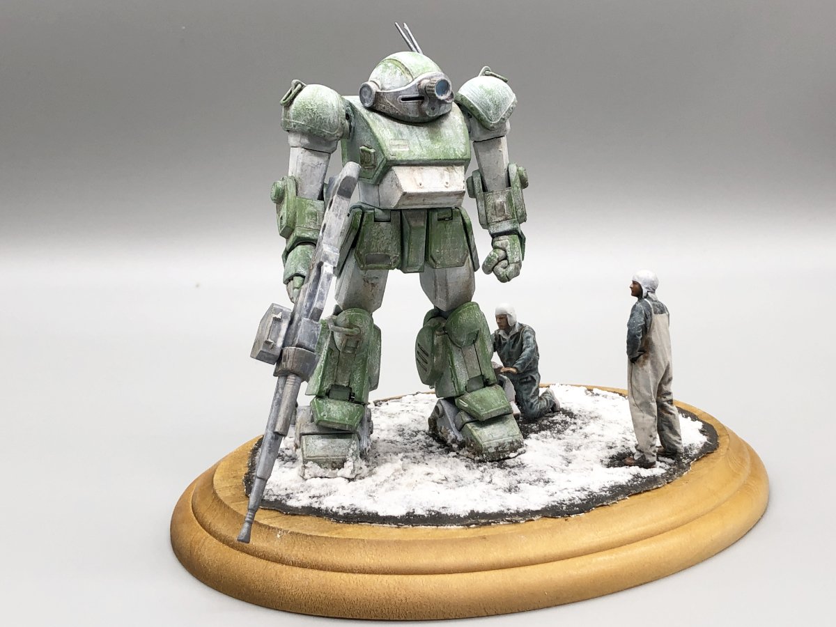 タミヤの兵士と組み合わせて再現された、寒冷地仕様のスコープドッグの整備風景の見事なジオラマですね!