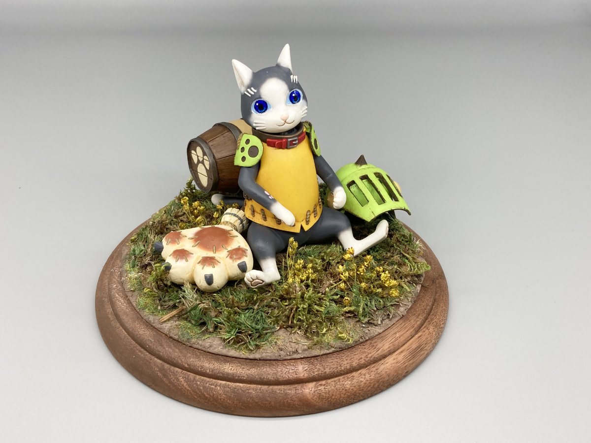 その可愛らしさを増大させている塗りの技術も素晴らしいです!瞳もクリアが入っていてウルウルしていますし、ジオラマの草も元々は枯草だったとの事でファレホで彩色して明るくしたと仰っておりました。どんぐり装備も見事で兜のチッピングが歴戦を戦い抜いた味を出しています・・いや可愛すぎる。