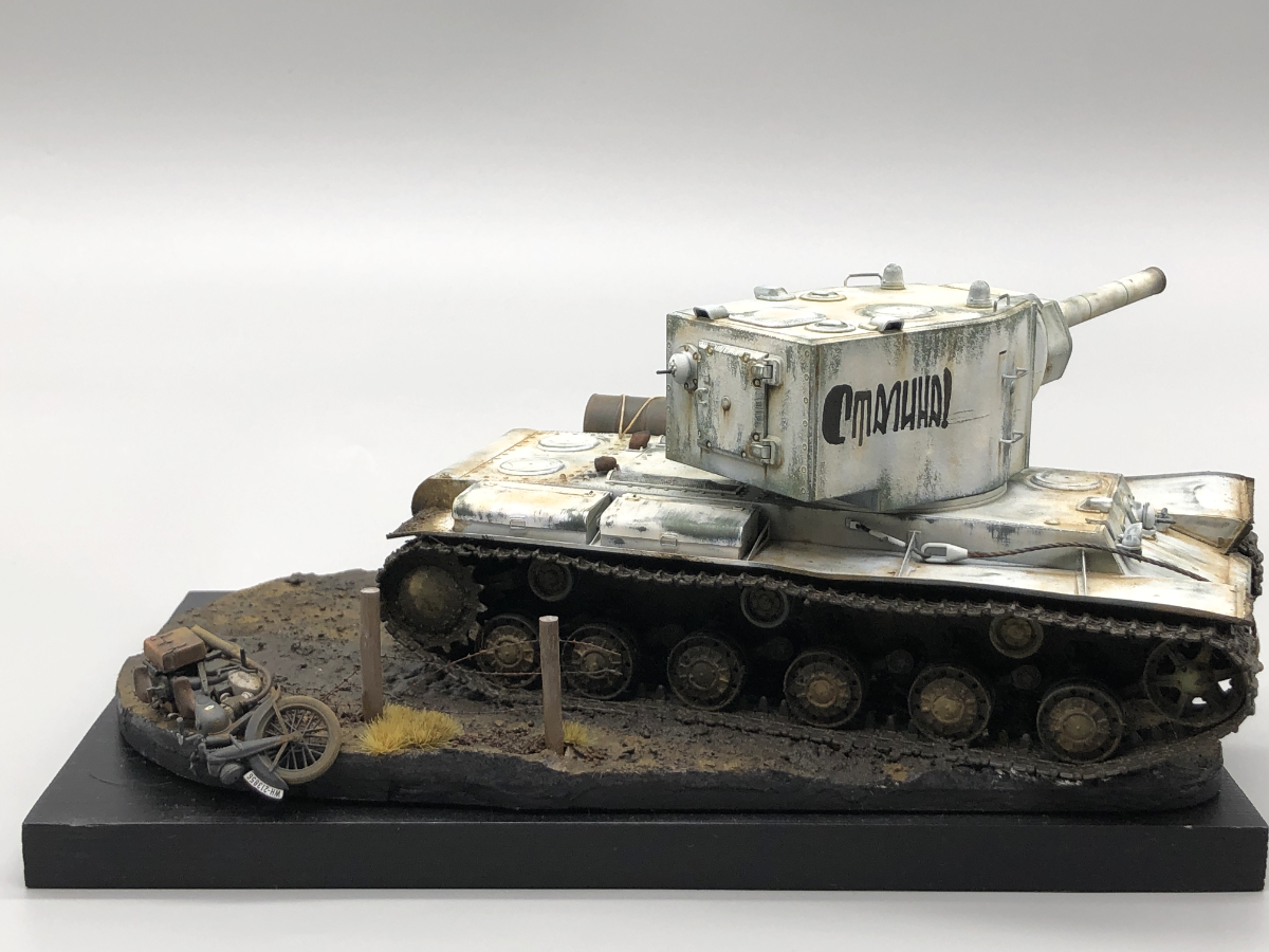 フェンダーの破損・砲塔の角度により物語性を産み出しているKV-2。