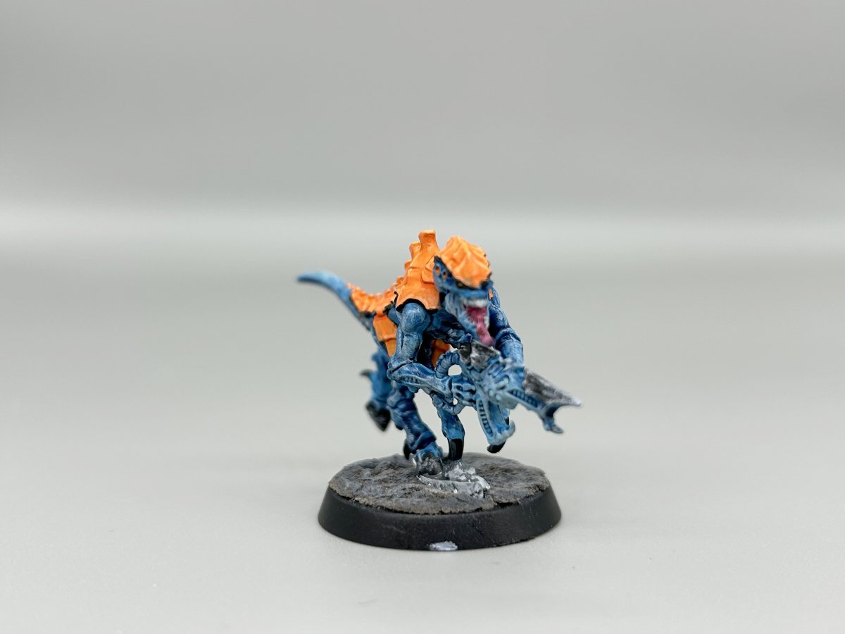 ウォーハンマ―のティラニッドをド派手なカラーで塗装してますね!オリジナルは白っぽいエイリアンみたいなカラーリングだったと思います。初の筆塗りという事ですが色の陰影をしっかりとしていますし顔の塗り分けなどは小さいミニチュアなのにばっちりと描き込まれていてより凶悪な生命体の雰囲気を作っていますね!