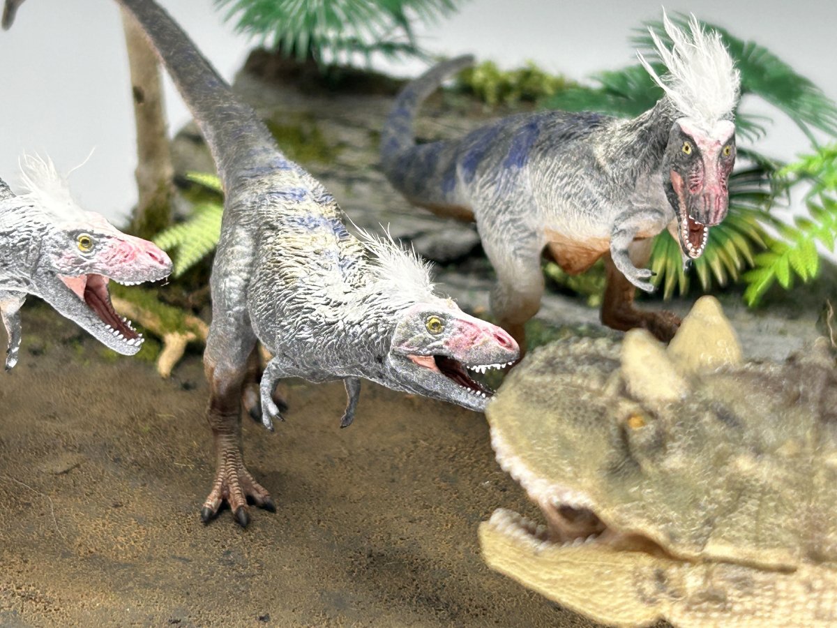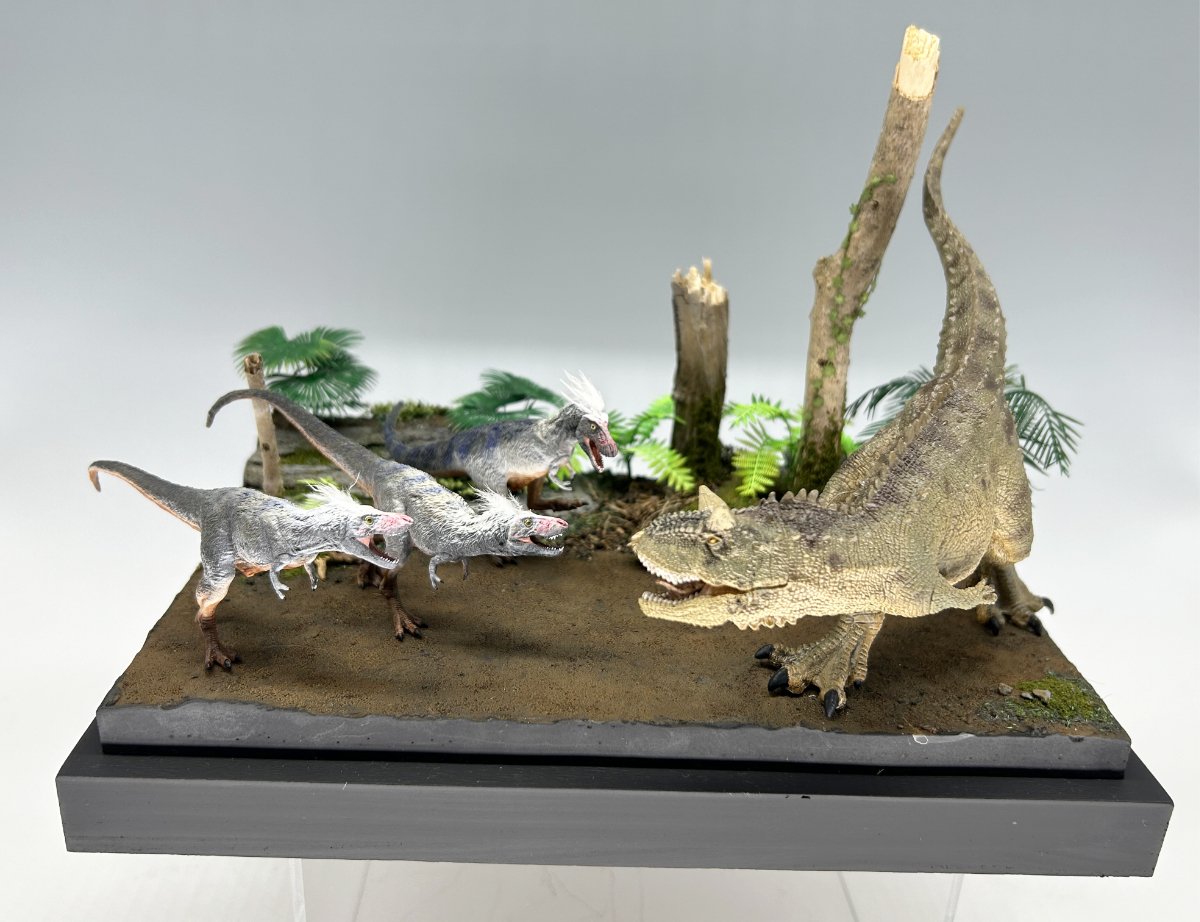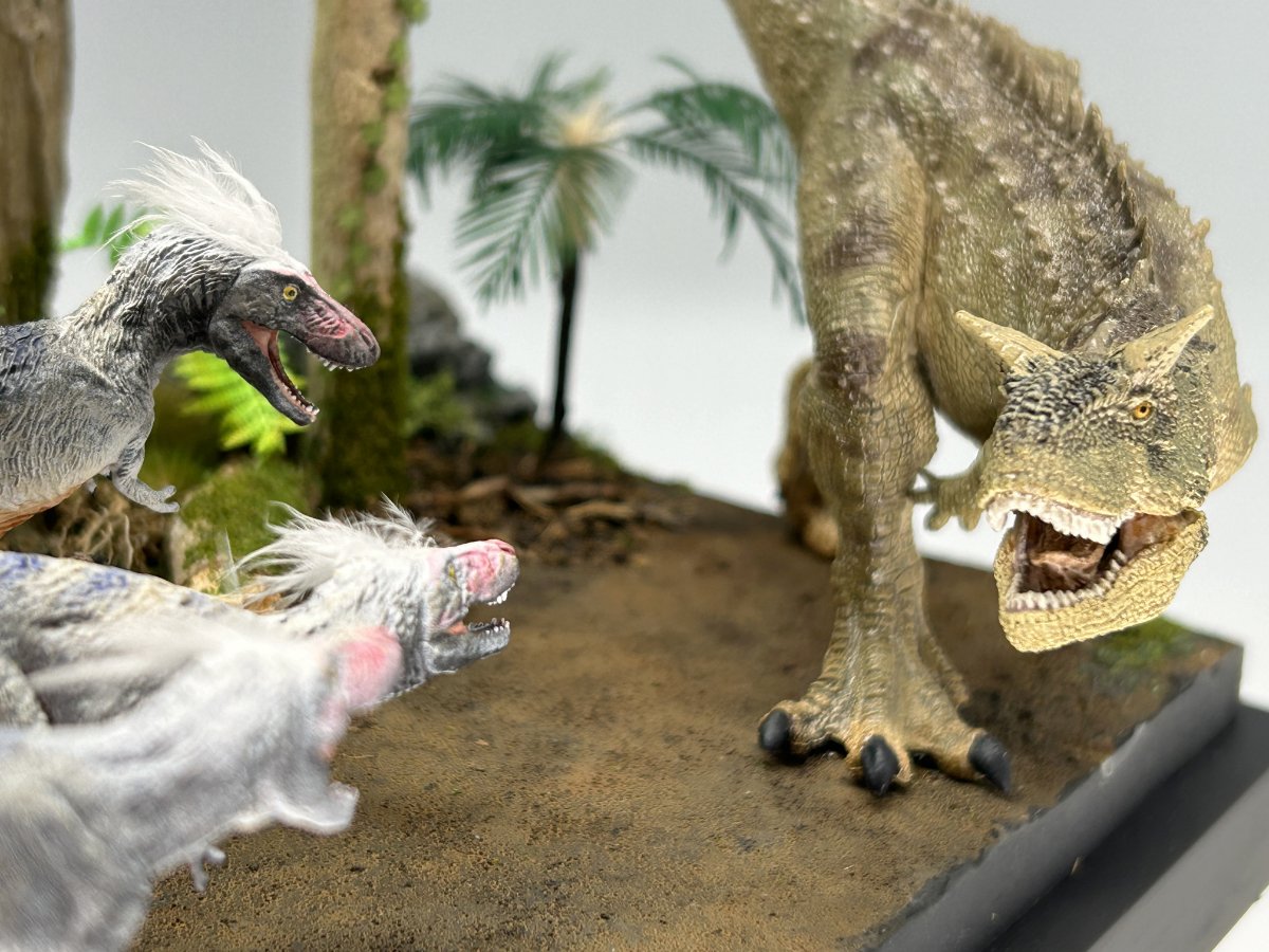 ティラノ幼体の羽毛は自宅で飼っているインコの物を使ったとの事!カルノタウルスはPapoの完成品のリペイントでしょうか?幼体のティラノサウルスが3匹?3頭?で大きなカルノタウルスに果敢に挑む姿がジオラマで表現されています!ティラノサウルスの羽毛から背中にかけての描き込みが凄いです‥カルノタウルスの皮膚の模様も爬虫類感があり凄くリアルです!