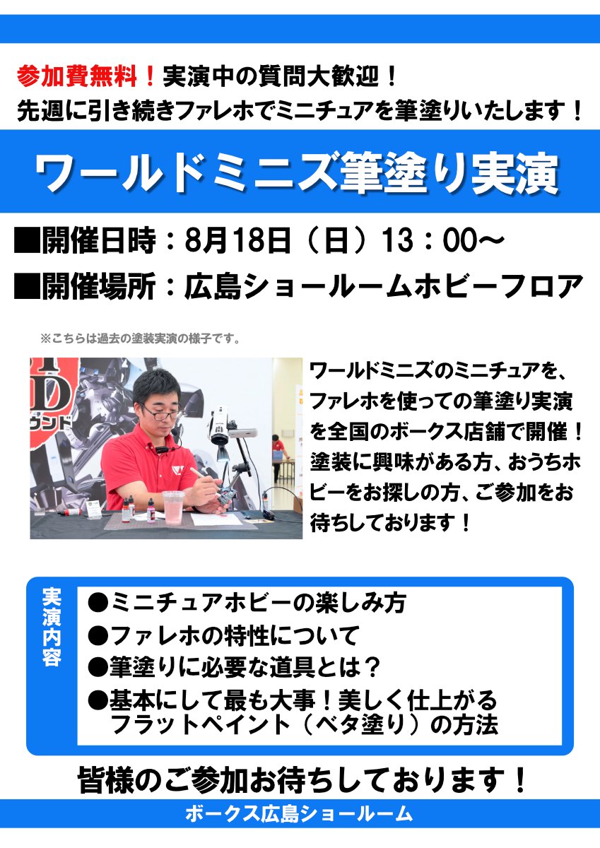 ワールドミニズのミニチュアを、ファレホを使っての筆塗り実演を8月18日(日)に全国のボークス店舗で開催!