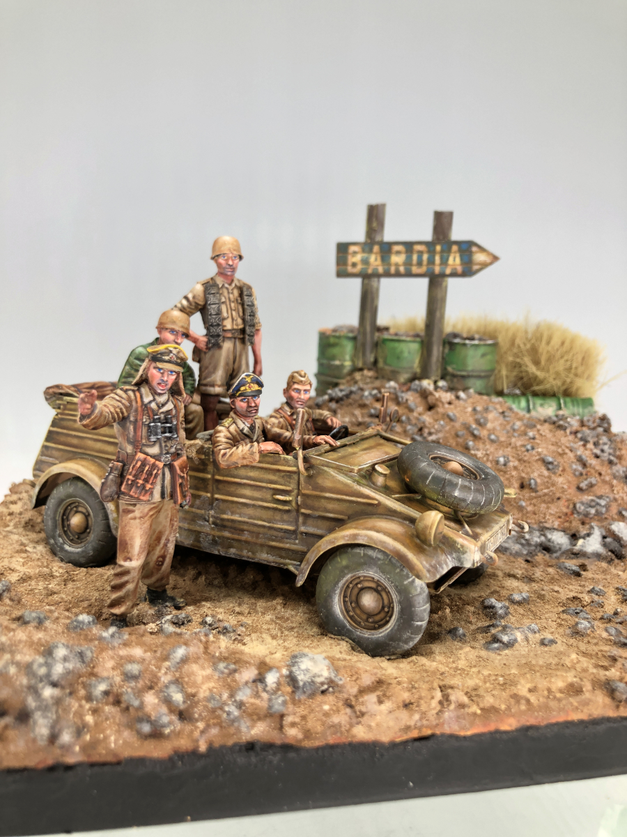 コメント:キューベルワーゲンと兵士の塗装にファレホを使用。エクスプレスカラーやウォッシュを使って顔を塗ってみました。兵士の視線が統一して見えるようにこだわりました。