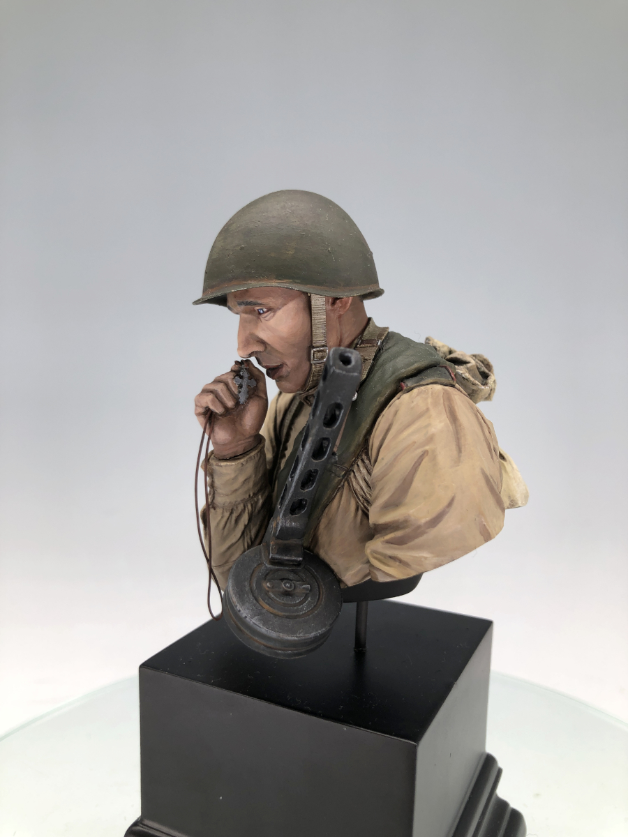 コメントには絶望感とありましたが私は何となく十字架のペンダントに祈りを捧げる綺麗な碧眼が平和への希望を感じさせる作品だなぁと思いました!銃器の錆具合や表情の描き込み、光の角度の意識など高い技術力で塗りあげられていますね。よく見ないと気が付きませんがヘルメットの影も顔に描きこんでるのが流石ですね。