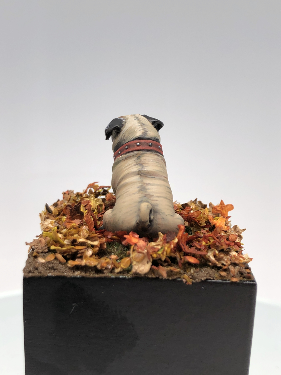 紅葉に埋もれるパグを見事に再現しています!落ち葉の森具合もパグのサイズ感とマッチしていてより可愛らしさを演出していますね。紅葉の情景もですがパグの毛並みをこの小ささに落とし込むのは流石ですね!