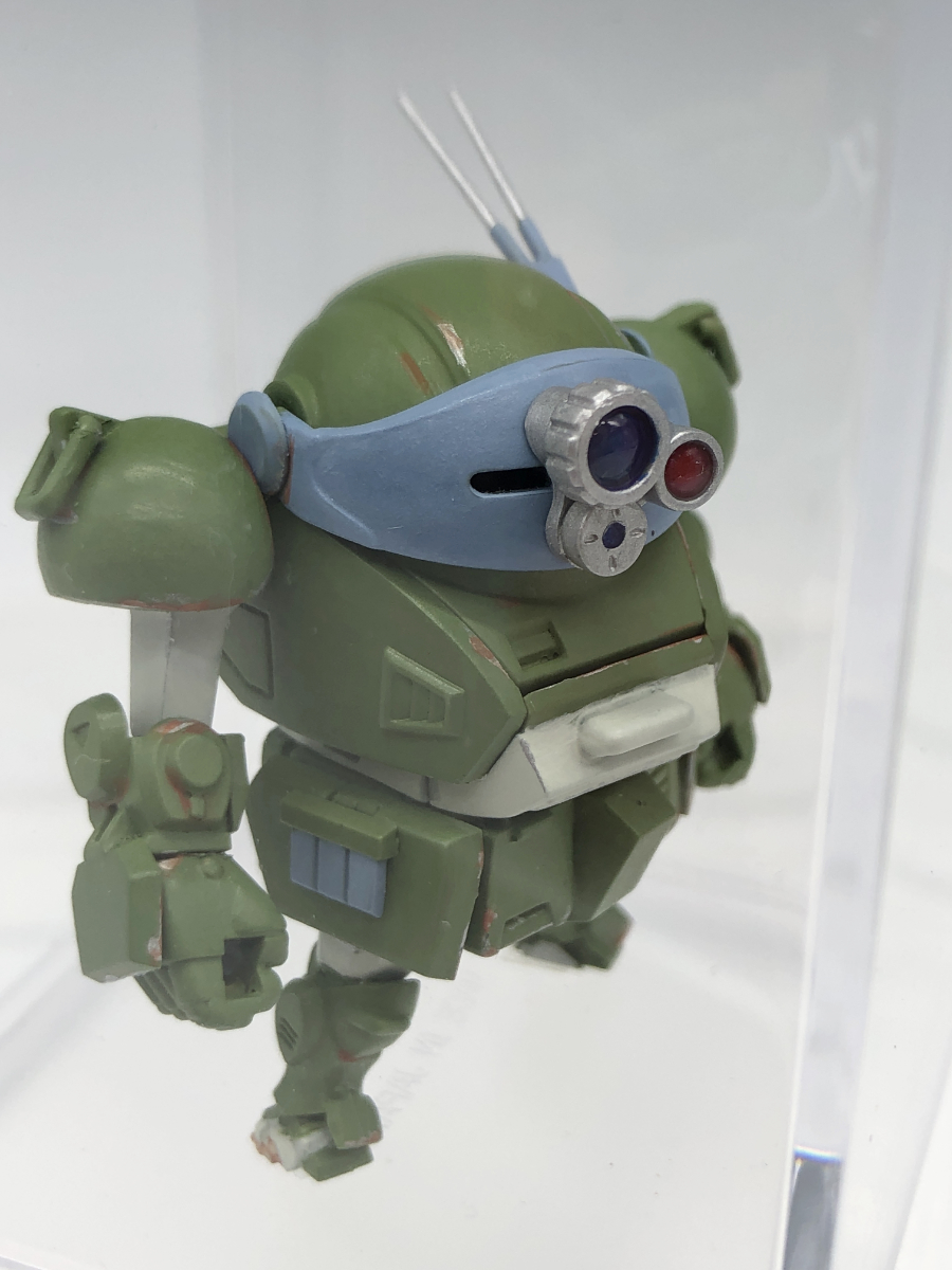 広島のスタッフもですが皆さん、炎のさだめが好きですね。小さくディフォルメされたスコープドッグをオールファレホで可愛く格好良く塗装されていますね!!各部分の色のチョイスも素晴らしいです。そしてレンズはファレホを塗った後にレジンを盛りつけて整形されたそうです!市販品と思うくらい綺麗なレンズです!ちなみに3つのレンズは標準ズーム、精密照準、広角になっているそうですよ‥アイフォ‥おっと誰か来たようだ。