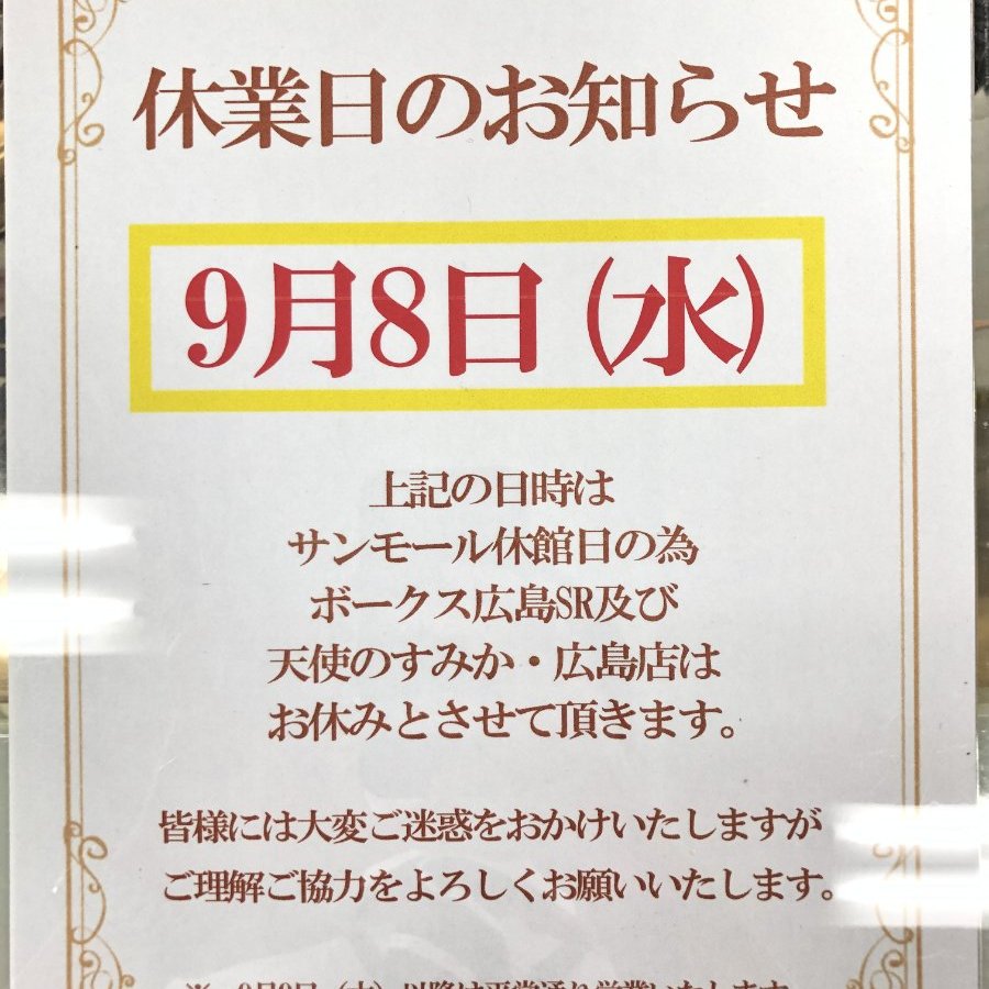 【広島ショールーム/天使のすみか広島店】9月7日(水)臨時休業のお知らせ