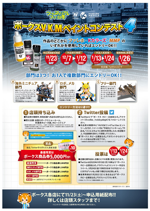 「【イベント情報】「ボークスV.K.M.ペイントコンテスト4」開催決定!!」をご覧いただくか、11月23日(土)より店頭にて配布開始の申込用紙をご覧下さい。