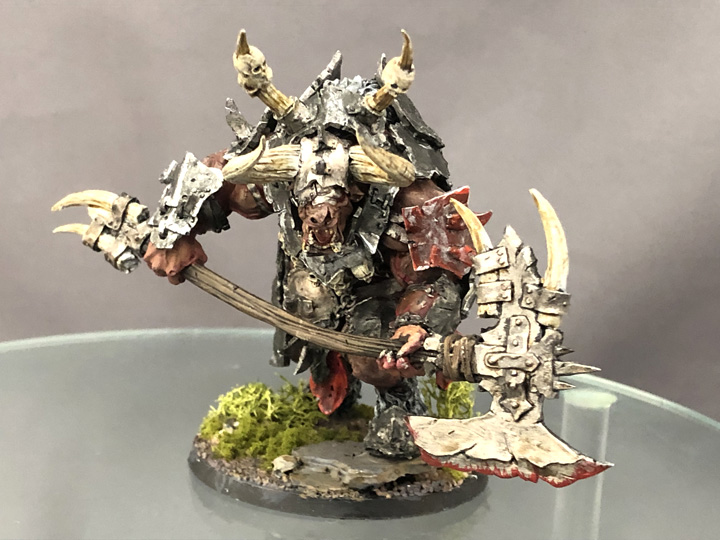 巨大な戦斧や鎧の各部についた数々の傷跡や返り血、弾けんばかりの筋肉の表現等々、細部に渡ってリアルに塗装され、歴戦の将軍の風格が見ているだけでも伝わってまいります。