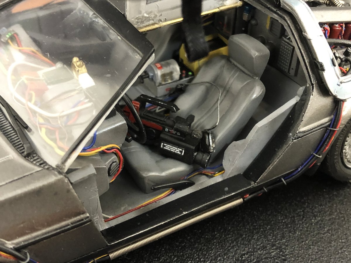 細部に至るまで見事に作りこんであり、ダッシュボードには目覚まし時計、当時世界最小最軽量だったビクターのビデオカメラ、ダースベイダーに扮してジョージの脳を破壊するのに使ったウォークマン等々小ネタもたくさん仕込まれており、無限様のデロリアンへのこだわりが伝わって参ります。