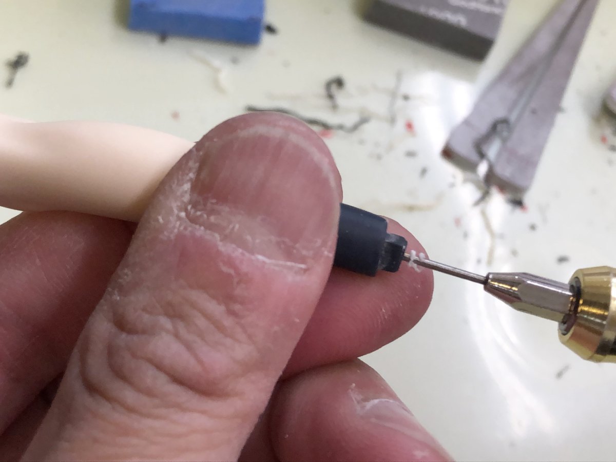 今回は1ミリ径の真鍮線で接続する予定でしたので、右腕の方は1ミリの穴のままにして、胴体の方の穴を3ミリ径のドリルで拡げます。