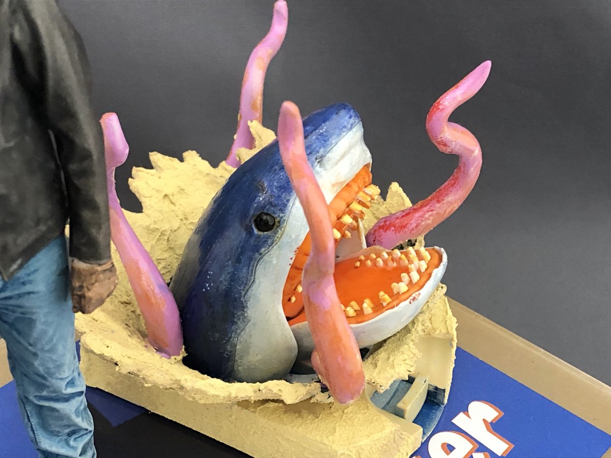 ビーチから飛び出してきた鮫のヌルッとした肌の質感とか実に生魚っぽいですし、黄ばんだ牙は怪獣映画によくある感じで良いですね~