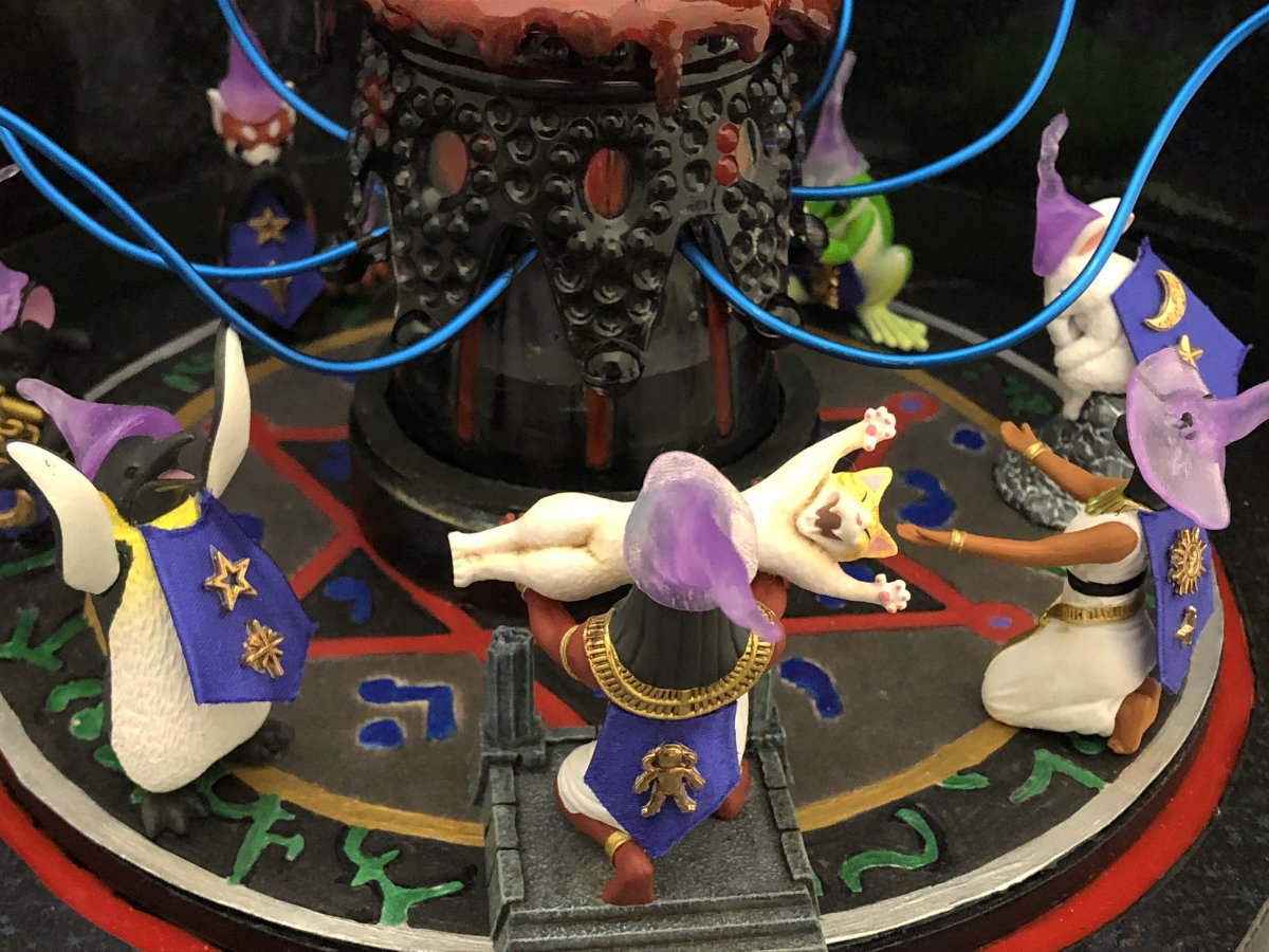 かたや邪神教団?のメンバーはトト神の他にバステト、ウサギ、カエル、アライグマにネコ、ペンギンにハニワ!?となかなかにバラエティに富んだメンバーで、本人たちは大真面目なのかもしれませんが実に楽しそう!