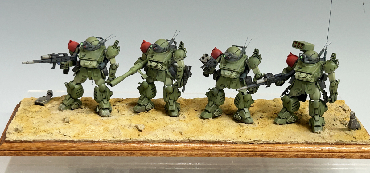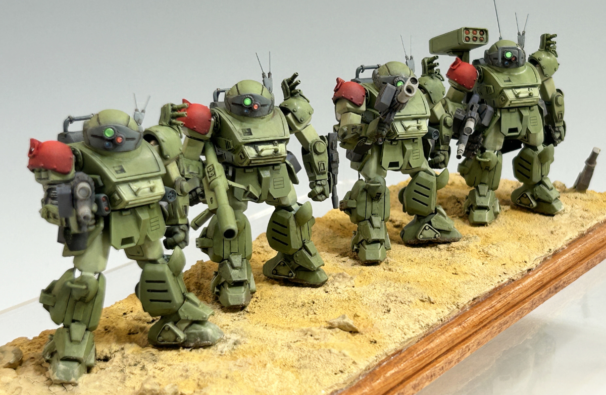 小スケールながらも塗り分けやウェザリングがしっかり行われており、荒れ地のジオラマと相まってボトムズらしい泥臭ささが感じられます!